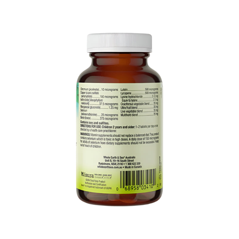 - Multiherb blend (organic echinacea, organic oregano, organic peppermint, organic spearmint, organic alfalfa, organic globe artichoke, organic beetroot, organic capsicum, organic cabbage, organic cauliflower, organic celery, organic coriander, organic kale, kelp, organic parsley, organic tomato, organic watercress) 20 mg