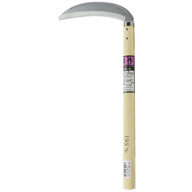 This Mikadukigama grass sickle is a premium quality tool made from Japanese stainless steel, heat treated precision ground, then fitted to quality wood handle. The blade is curved and sharp.
