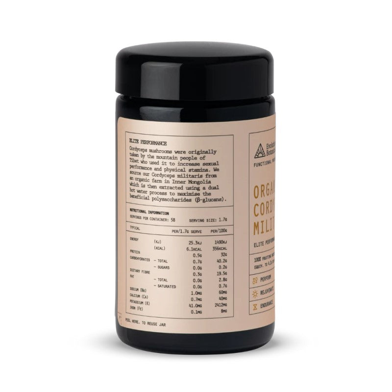 The quality of raw materials being critical, these Cordyceps militaris are ethically and sustainably sourced from an organic farm in Inner Mongolia. Evolution Botanicals use a dual hot water extraction process (no alcohol used) to maximise the beneficial polysaccharides (β-glucans).