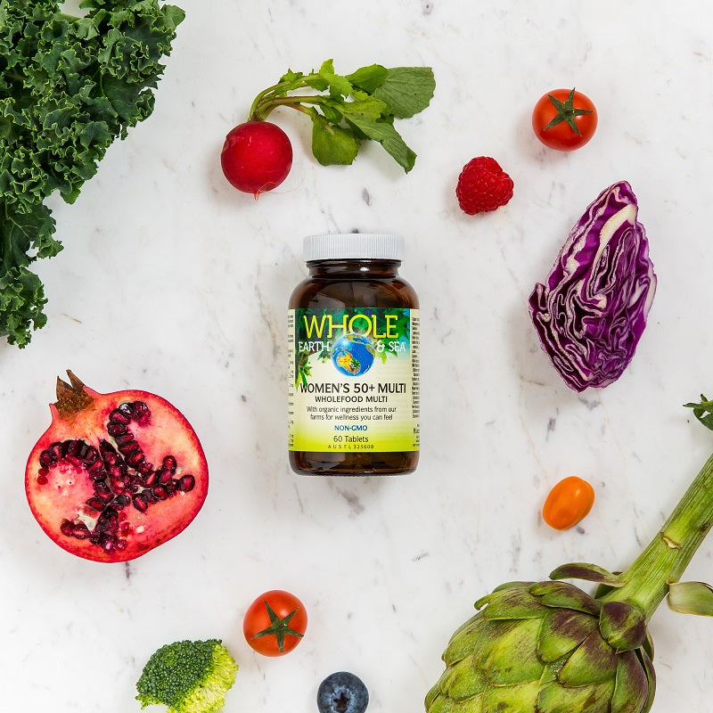 Women’s 50+ Multi is a supplement containing the full range of nutrients to support the needs of women over the age of 50. It has more than 20 vitamins and minerals, along with a wide array of enzymes, antioxidants and polyphenols from our Farm Fresh Factors™ blends and other wholefood ingredients.